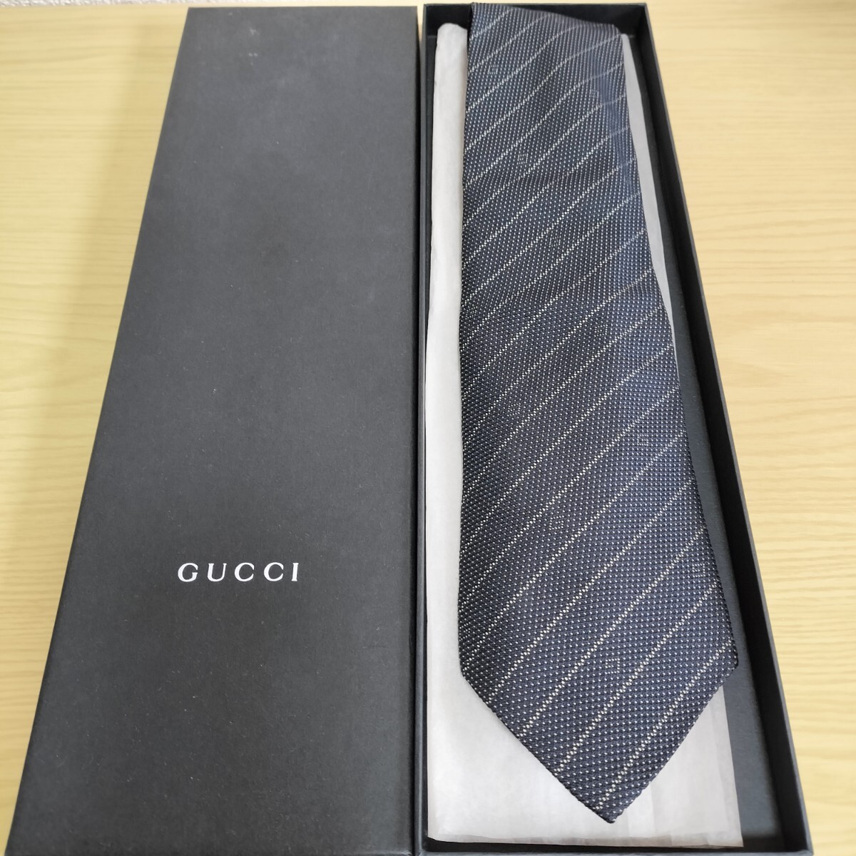 - グッチ(GUCCI)黒灰色点々ストライプGロゴ模様ネクタイ