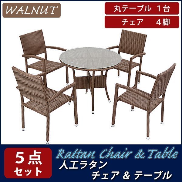 - 送料無料 ガーデンチェア ガーデン チェア ラタンチェア ラタン テーブル ラタンテーブル 人工ラタンチェア4脚 丸テーブル1台 5点セット 茶