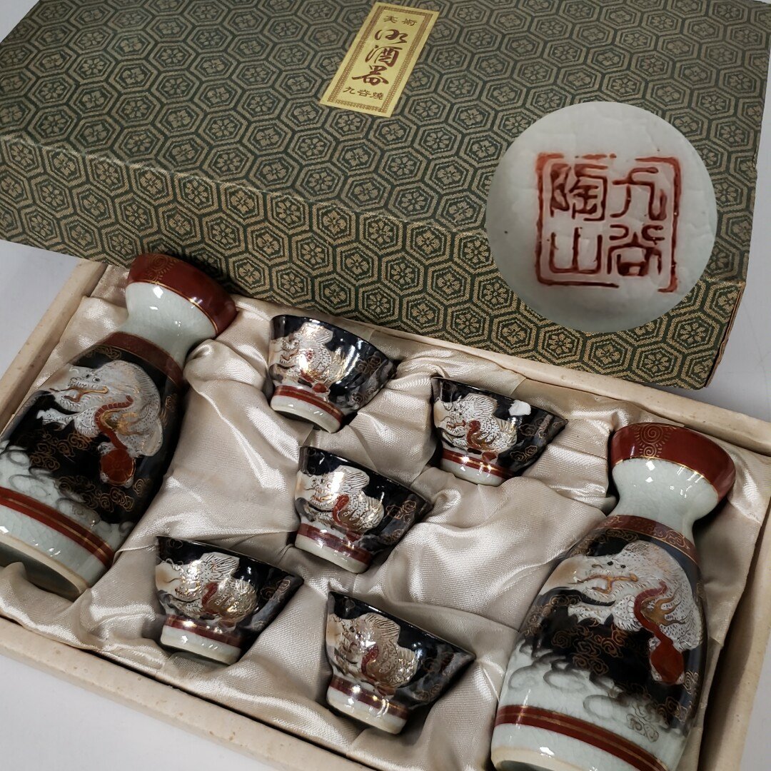 - 九谷焼 酒器セット 陶山 白竜 徳利 紙箱 一対 お猪口 五客 ぐい呑み 酒杯 金彩 骨董 古い レトロ 美術品 和食器 縁起物 蔵出【80e2919】