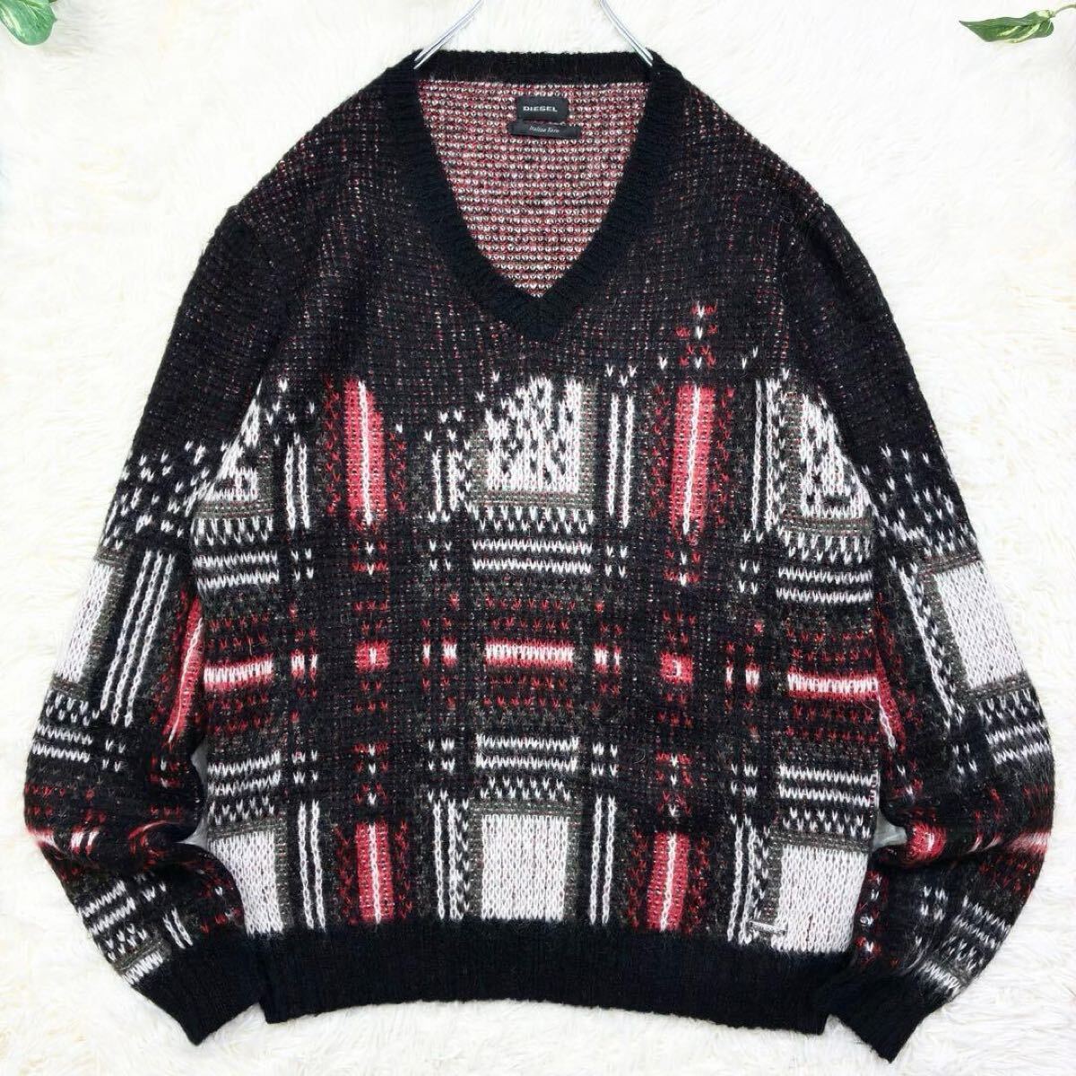 - 美品 DIESEL ディーゼル モヘヤ混 総柄 ニット セーター ブイネック イタリアンヤーン ク Vネック XL 大きいサイズ