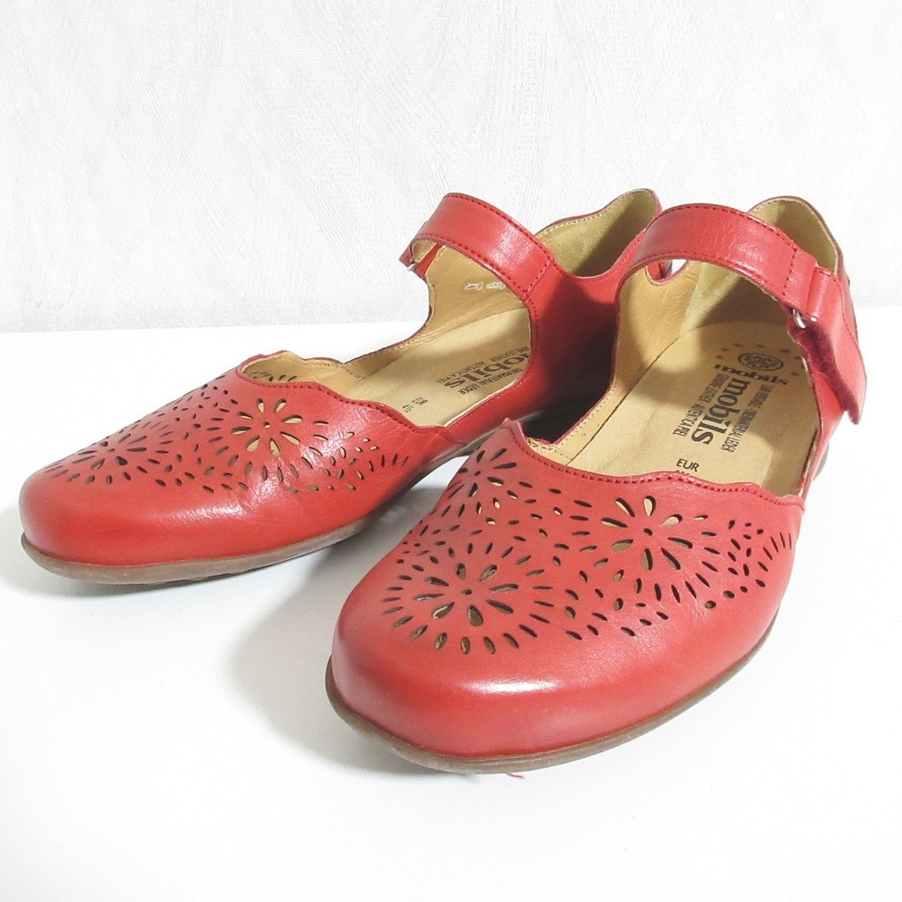 - 美品 mobils モビルス FLORINA PERF カットワーク レザー フラットシューズ ストラップ パンプス 4 1/2 24cm レッド