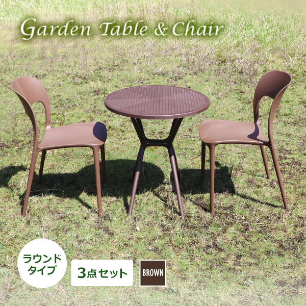 - 送料無料 プラスチックチェア ガーデンチェア ガーデンテーブル 3点セット UVカット ブラウン ラウンドテーブル 2脚 軽量 ポリプロピレン