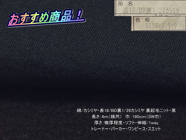 - 綿/カシミヤ 裏起毛ニット 微厚 ソフト 1way 黒 4mSW
