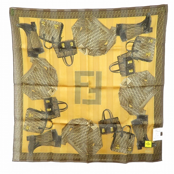 - #ae フェンディ FENDI ハンカチ 大判 茶系 ベージュ系 ズッカ柄 バッグ柄 ブーツ柄 ポロシャツ柄 コットン 美品 レディース [967594] k01