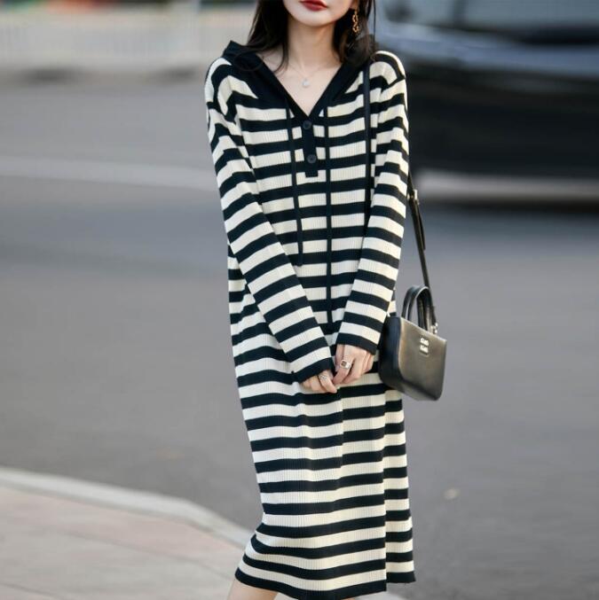 - 新入荷上質秋ニットワンピース 大人 長袖 きれいめ ボーダー柄 ロングワンピースフード付き 上品 大人 着やせ マキシワンピース杏