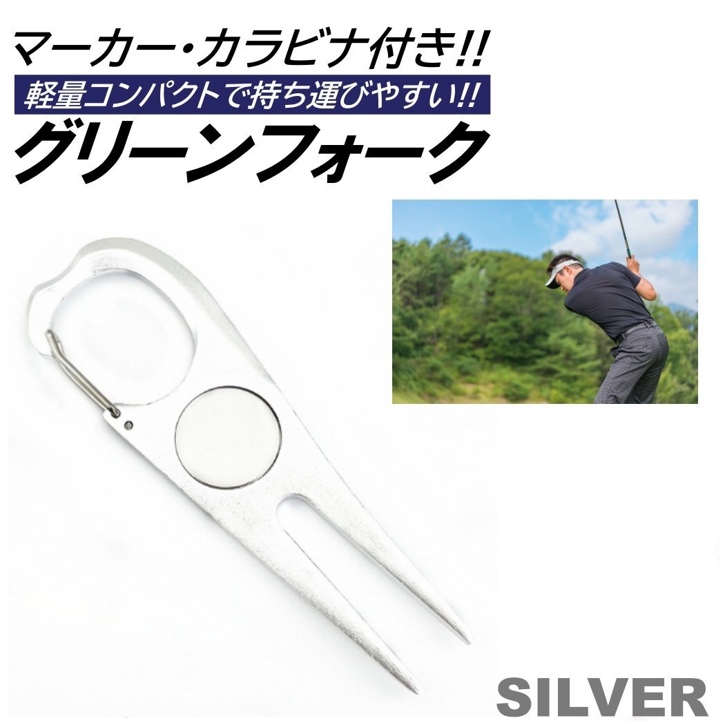 > シルバー グリーンフォーク ゴルフ マーカー カラビナ シンプル ラウンド リペアツール ピッチマーク コンペ おしゃれ ディボット ツール