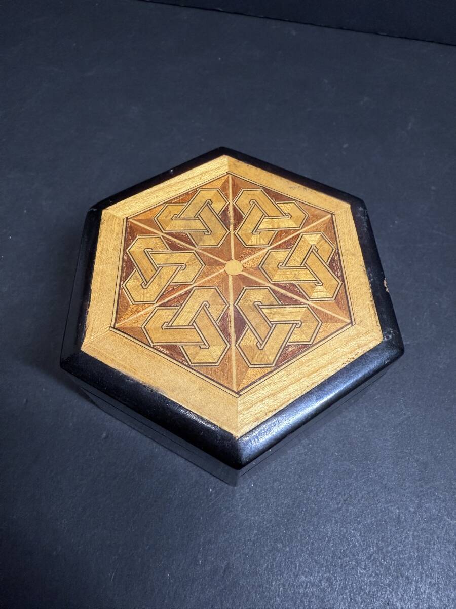 - ★コレクター必見 寄木細工? 木製 小物入れ 木箱 幾何学模様 六角 木工 工芸品 ビンテージ コレクション GT993
