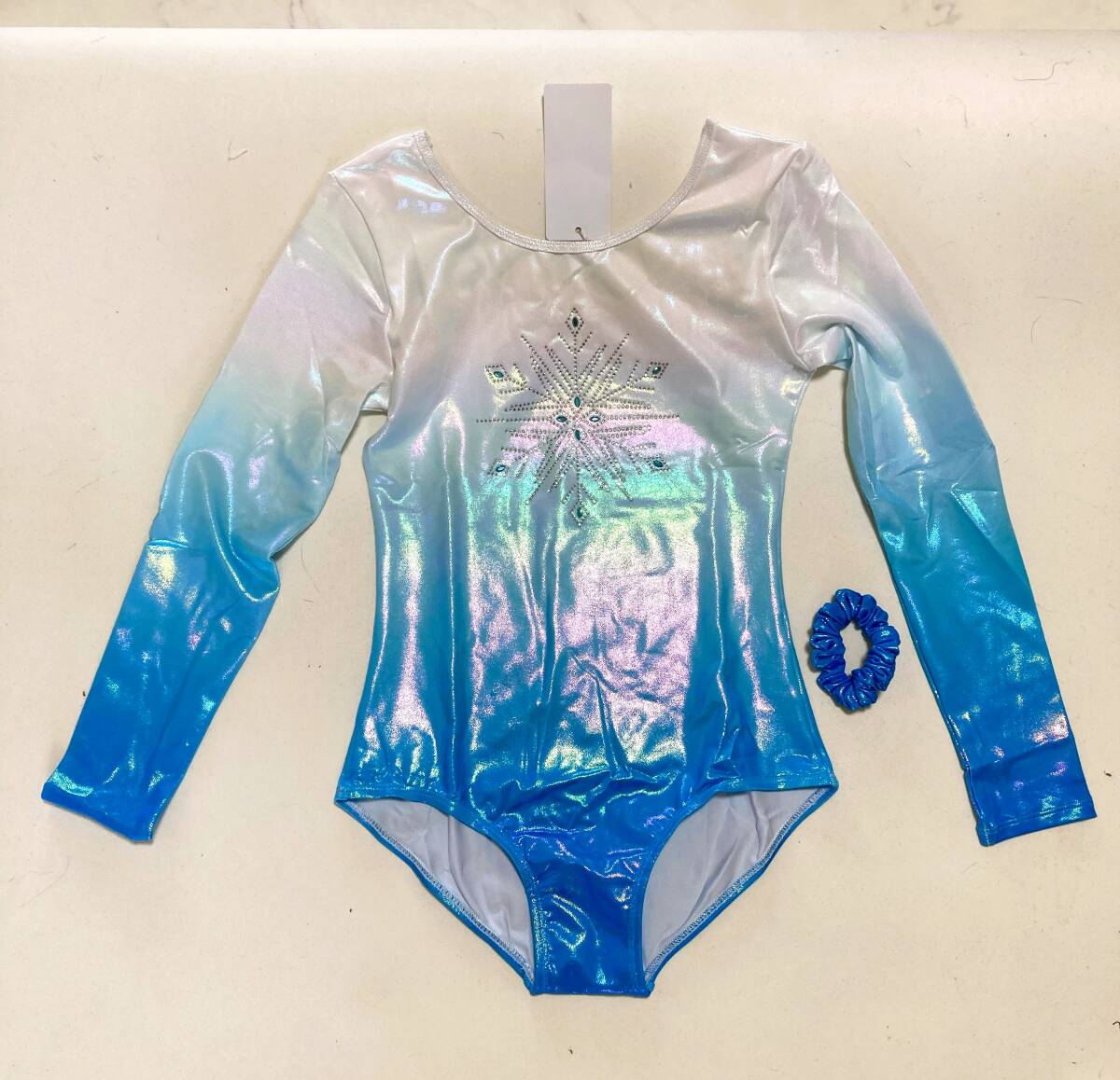 > US14サイズ/ Poly Unicorn ブルー&白カラー ロングスリーブ 長袖レオタードシュシュ付 ツルスベ メタリック キラキラ ラインストーン