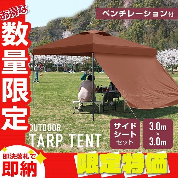 > 【限定セール】サイドシート付 タープテント 3m ベンチレーション 収納ケース 撥水 スチールフレーム UVカット アウトドア BBQ ブラウン