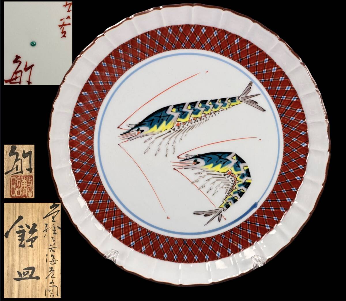 - 【偲】九谷焼 武腰敏昭 色絵 海老図 飾皿 大皿 額皿 直径25cm 高さ約3.5cm 在銘 共箱 共布 j-329