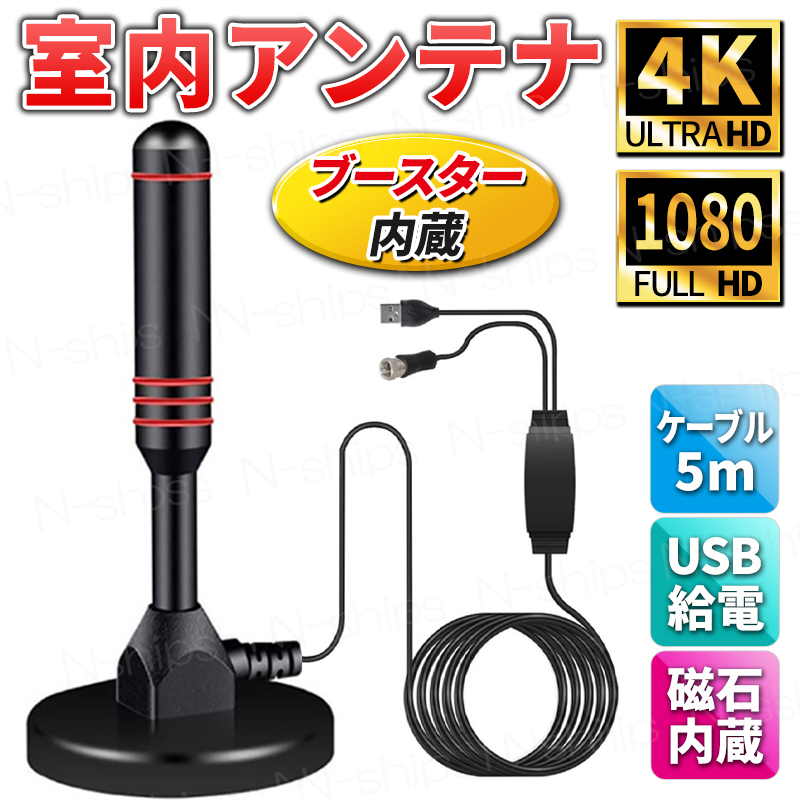 - 室内アンテナ 屋内 ブースター内蔵 4K HD テレビ TV ロッド 地デジ 高感度 高性能 ポータブル デジタル UHF VHF 車載 小型 軽量 ワンセグ