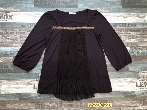 - after all アフターオール レディース スクエアネック プリーツ加工 ビーズ装飾 七分袖Tシャツ カットソー 紫 パープル M