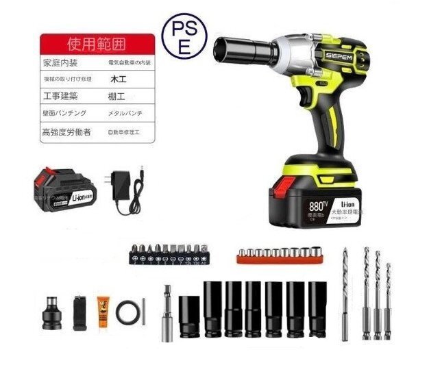 - 電動インパクトレンチセット, 1 台で 4 種類の用途があり、電動ドリルドライバー,タイヤの交換,大工と足場工用の電動工具