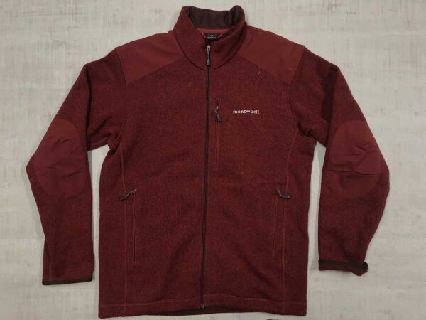- モンベル mont-bell アメカジ アウトドア ショルダー・エルボーパッチ モックネック ニットジャケット メンズ パイル編み L 赤