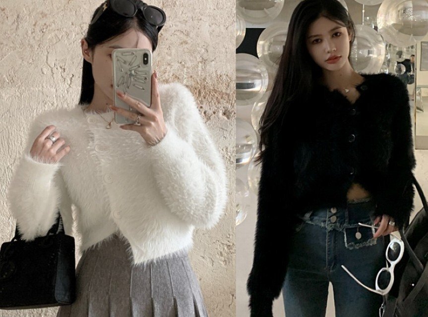 - トップス ニット ショート丈 長袖 ふわふわ もこもこ セーター カジュアル シンプル かわいい フリー ブラック