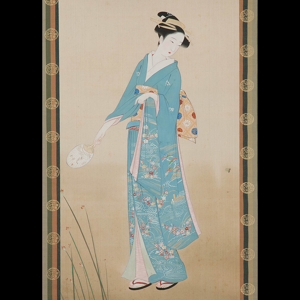 “商品説明の『続きを見る』もしくは携帯端末アプリの『もっと見る』から追加画像をご覧ください” 商品説明 品名 小早川清 『夏の夕』 絹本 彩色 掛軸 共箱 真作 寸法 軸・・・縦213.5cm 横51.5cm 内・・・縦121cm 横36.5cm ※寸法に若干の誤差が生じます。ご承知下さい。 状態 本紙:シミ、シワ 表具:裏シミ 箱:良好 略歴 小早川清1899-1948 大正-昭和時代の日本画家。明治32年生まれ。福岡県出身。初号は清水。鏑木清方に美人画をまなぶ。大正13年の帝展に初入選し、昭和8年「旗亭涼宵」が特選となった。新版画の分野においても活躍した。専ら艶麗な美人画を画き、帝展時代には長崎を舞台とした異国情緒の溢れた画材を好んで画いた。帝展出品作に「長崎のお菊さん」「蘭館婦女の図」、文展に「春琴」「行く春」等がある。昭和23年4月4日死去。50歳。 備考 本品は印刷ではなく肉筆です。 補足 送料 ■ゆうパック100サイズ(詳細は以下の〈配送方法〉を参照して下さい) ※形状・性質が異なるものは同梱をお断りさせていただく場合がございます。同梱の場合、サイズ変更により表示される送料の金額を修正させていただく場合がございます。予めご了承いただきますようお願い致します。 ※2023年10月より日本郵便の郵便価格改定により、配送料を改訂させていただきます。何卒ご理解の程よろしくお願い致します。
