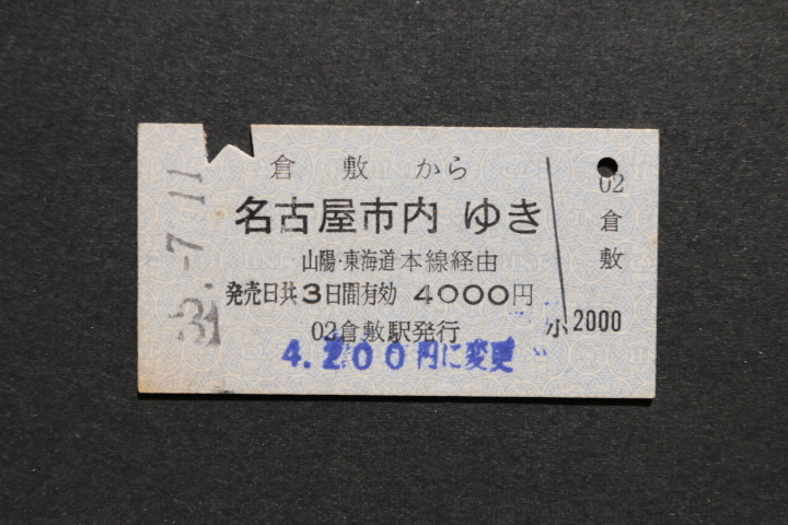 - 乗車券 倉敷から 名古屋市内ゆき 4000円