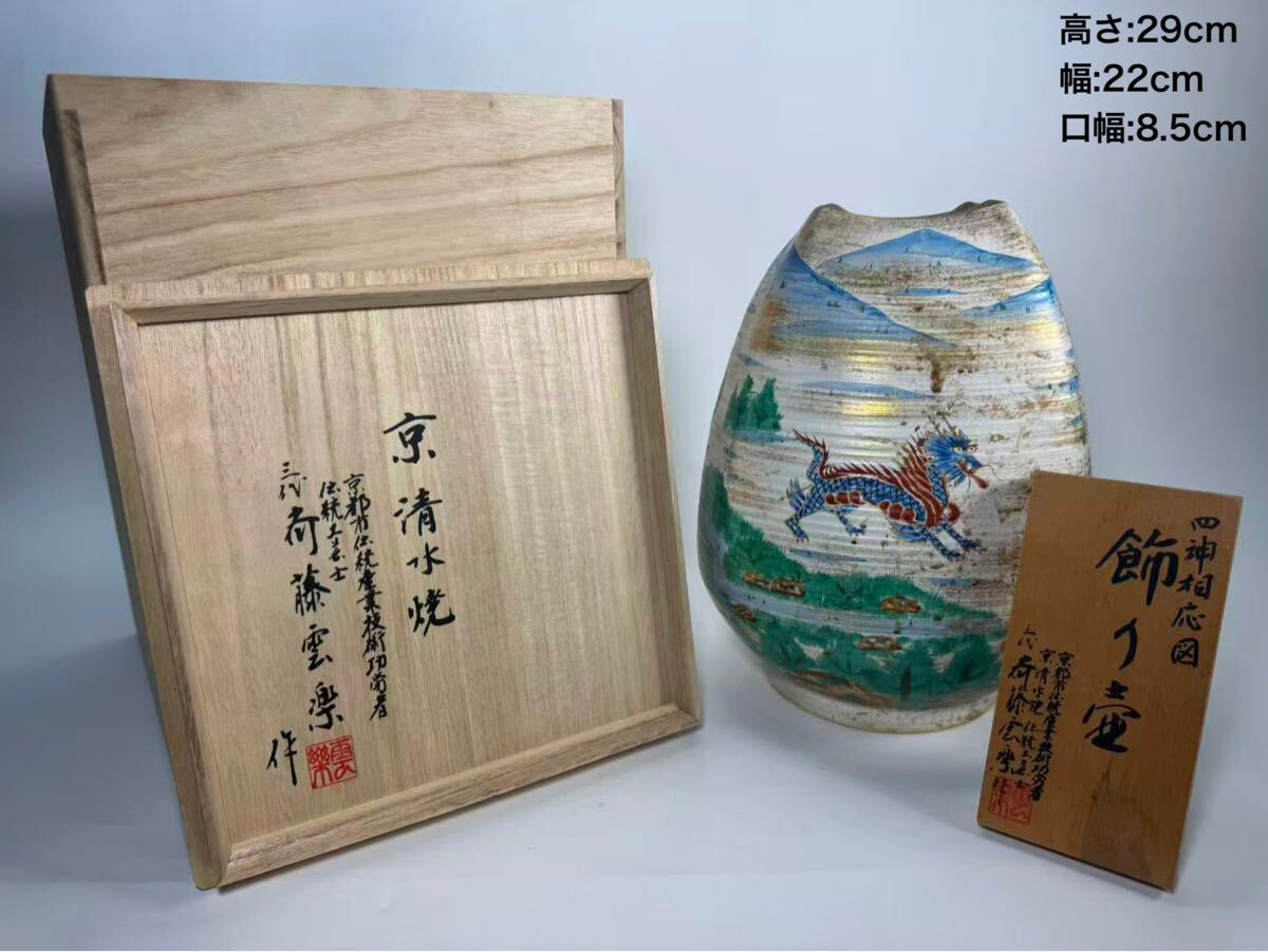 - DH706 △ 伝統工芸師 三代斎藤雲楽作 四神相応図 花瓶 飾壺 清水焼名匠 共箱立札付 H29cm