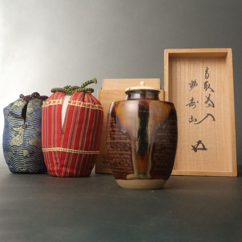 - 委託HK◇亀井楽山 高取肩衝茶入(眼鏡箱) 鵬雲斎書付 共箱 「寿山」※仕覆添え(茶道具 陶磁器 陶芸 福岡 茶器 抹茶 濃茶 裏千家 家元)