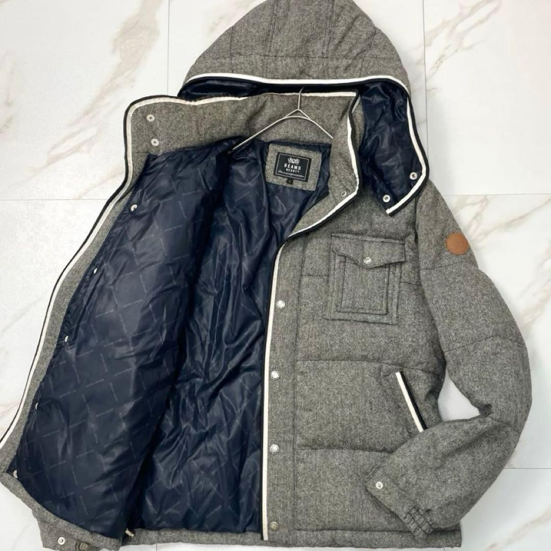 - 【2way L】BEAMS ダウンジャケット ウール ツイード調 フード着脱可 肉厚 パイピング レザープレート ブルゾン ロゴボタン グレー ビームス