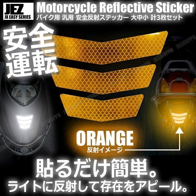 - 送料無料! バイク用 反射ステッカー [オレンジ] 大中小 各1枚 計3枚セット 安全 ツーリング 反射板 リフレクター シール 夜間 目立つ 後部