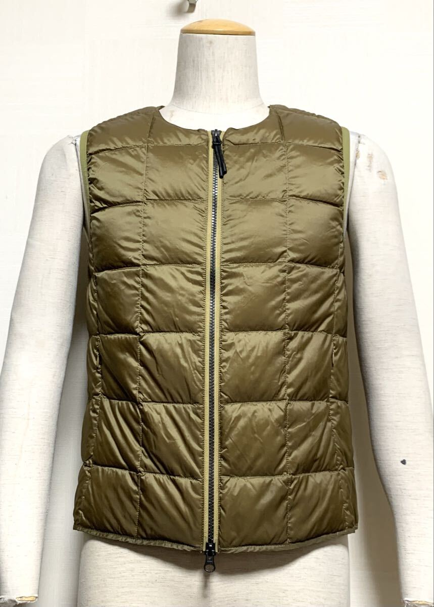 > 新品同様:TAION(タイオン).ノーカラー ライト ダウン ベスト M(レディース/RADIATE 別注/インナーダウン/Wジップ開/肩37幅46丈58/uniqlo)