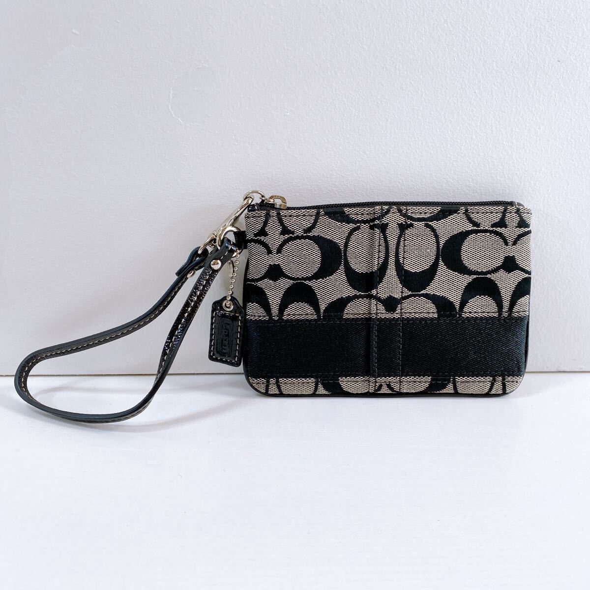 - 340【中古】COACH コーチ シグネチャー 小物入れ ポーチ ブラック キャンバス レザー カードケース ミニポーチ レディース 現状品