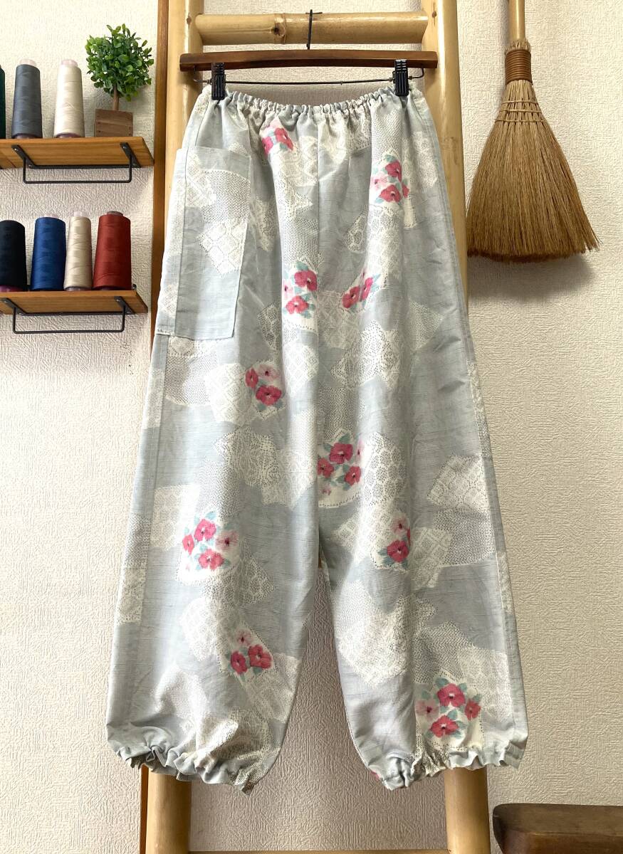 - 鎌倉まるか堂 着物リメイク 紬 絹鼠に椿舞扇のもんぺ風 ●絹 ●ゆったりまるっこいシルエット M~L●裾ふわパンツ●洗濯OK