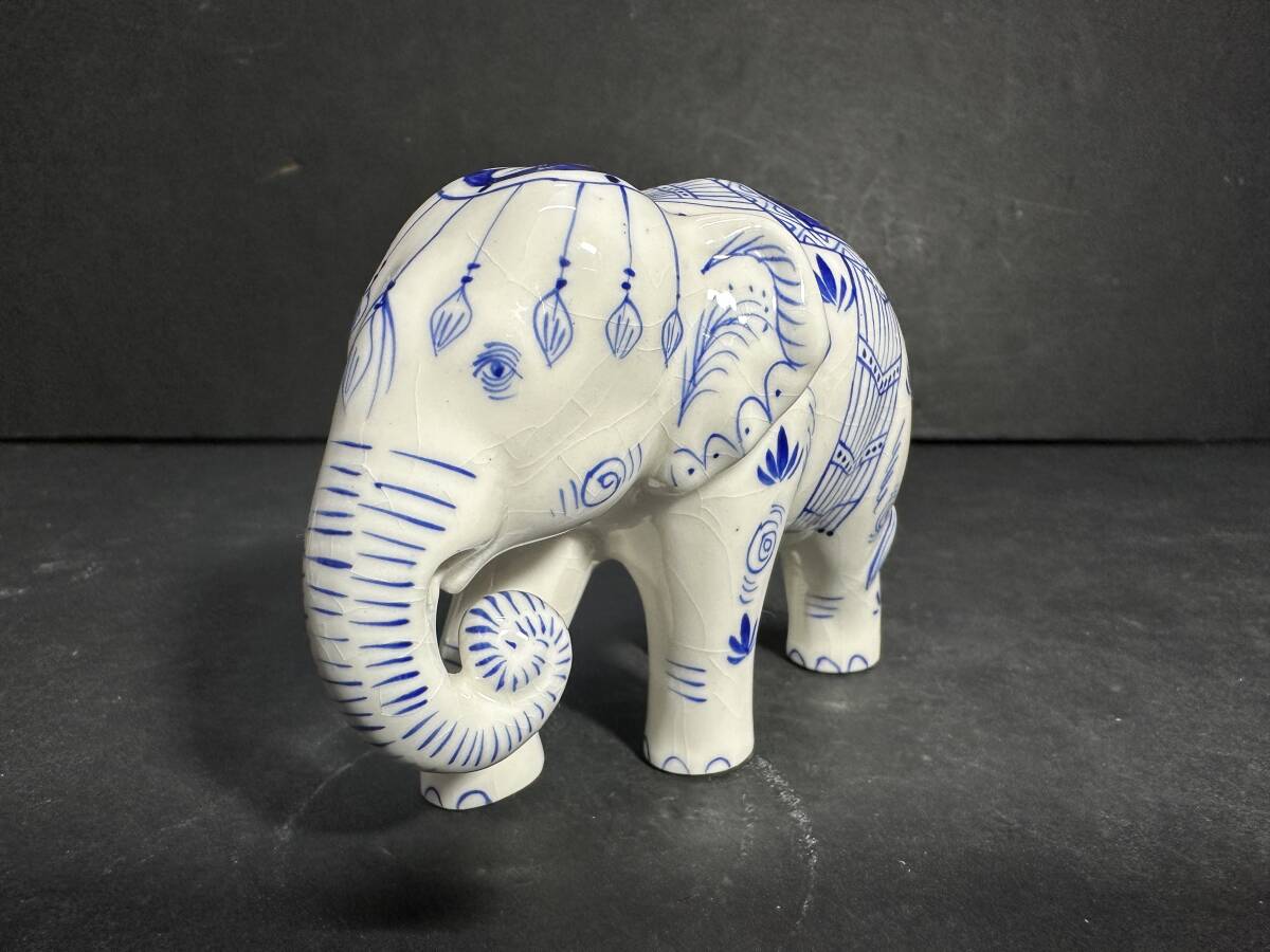 > ★コレクター必見!! 当時物 現状品 陶器製 青花 柄 タイ製? ゾウ 象 オブジェ 置物 白×青 インテリア 縁起物 お洒落 雑貨 飾り KZ889
