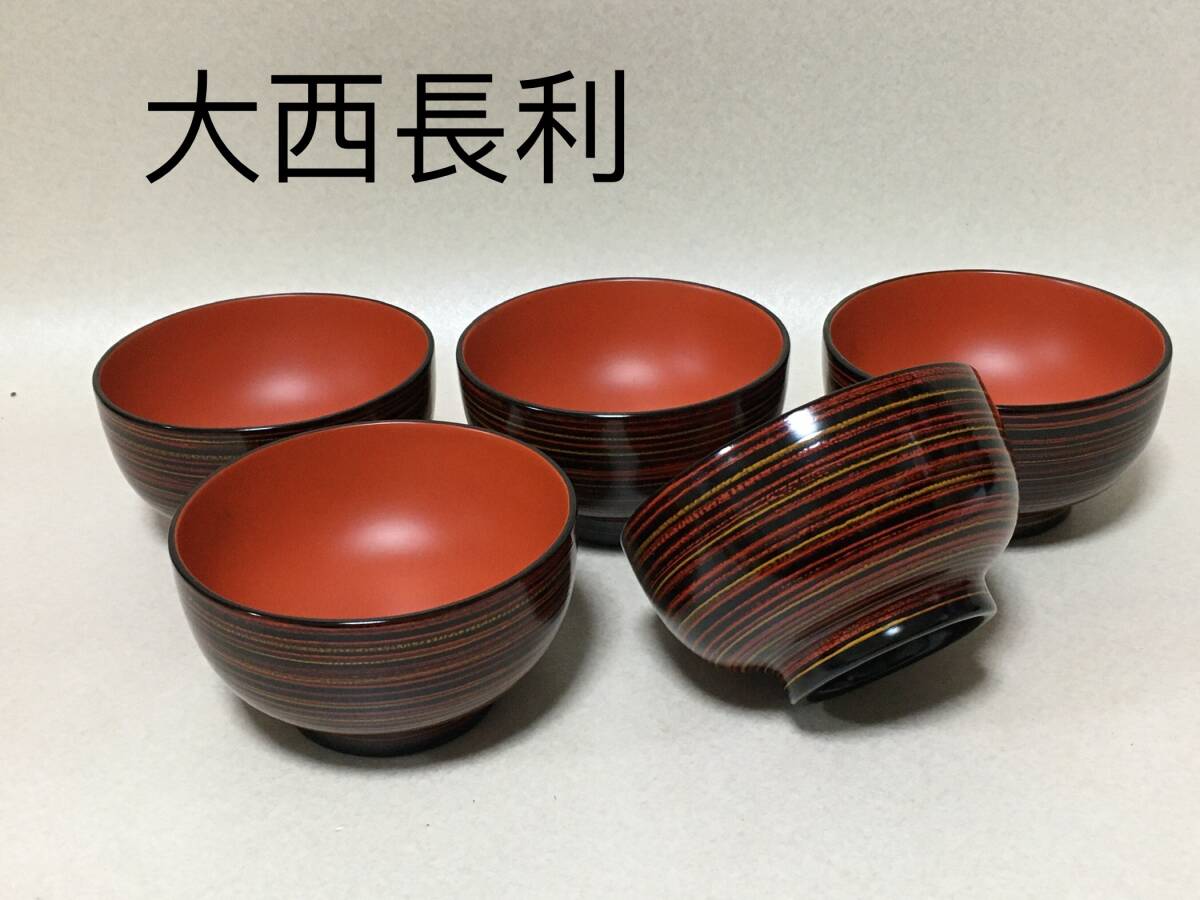 - E865 大西長利 作 天然木 赤線引 吸物椀 汁椀揃え 漆塗 朱塗 五客
