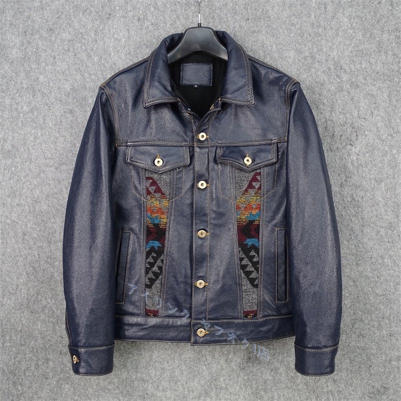 > ◆新品レザージャケット 上品 ナバホ柄切り替え 本革 牛革 暖かい ライダースジャケット 革ジャン S~5XL ネイビー