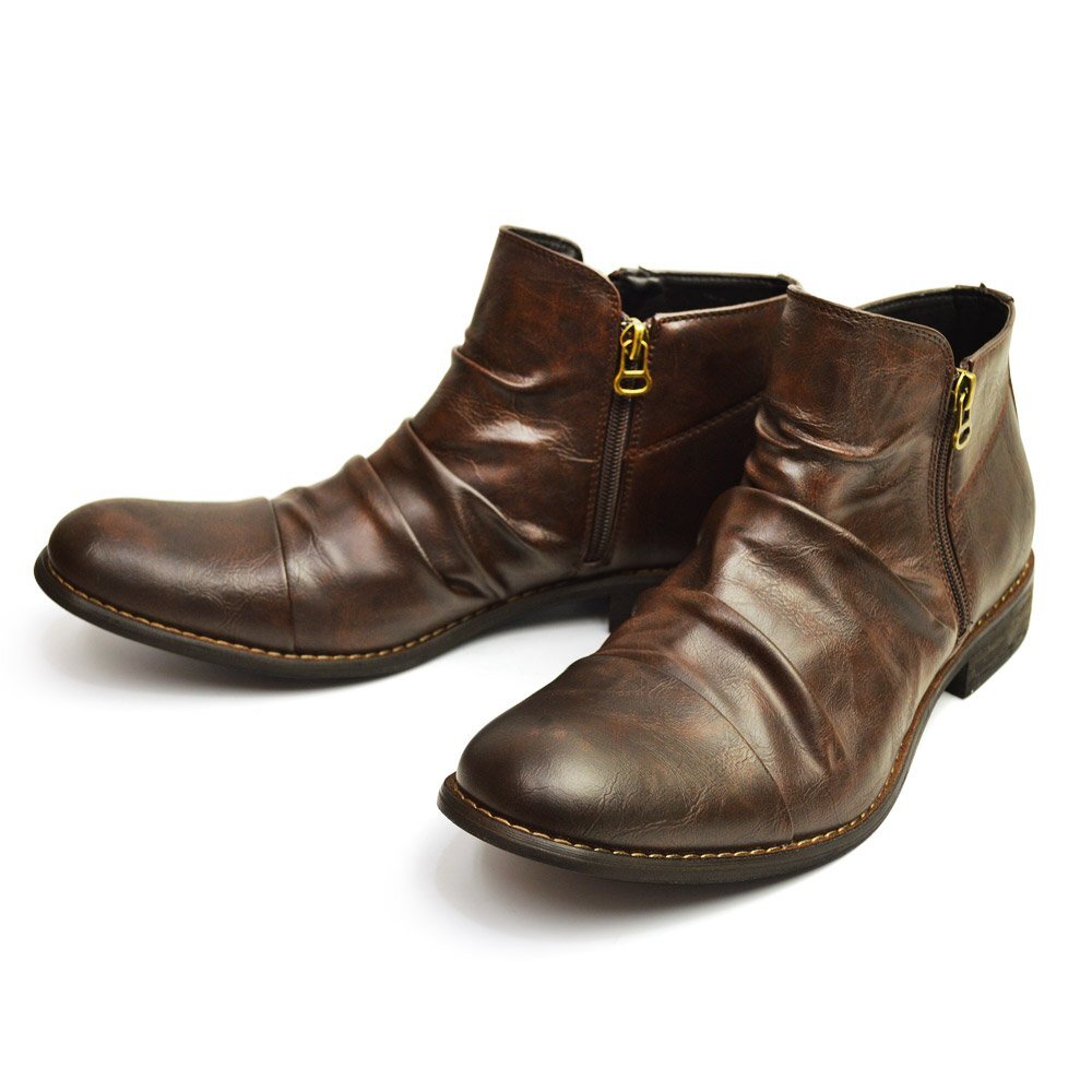 - 新品■25.5cm Wサイドジッパー ドレープブーツ チャッカブーツ アンティーク ブーツ ショートブーツ メンズ キレイめ ビンテージ 男 靴