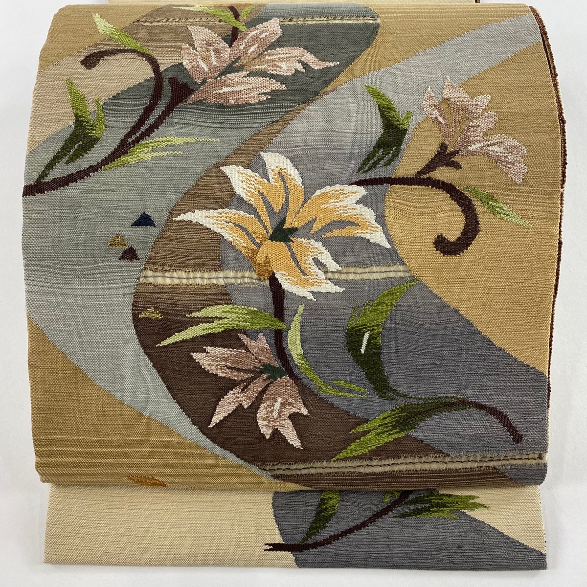 > 【美品】 袋帯 秀品 草花 ベージュ お太鼓柄 正絹 【中古】