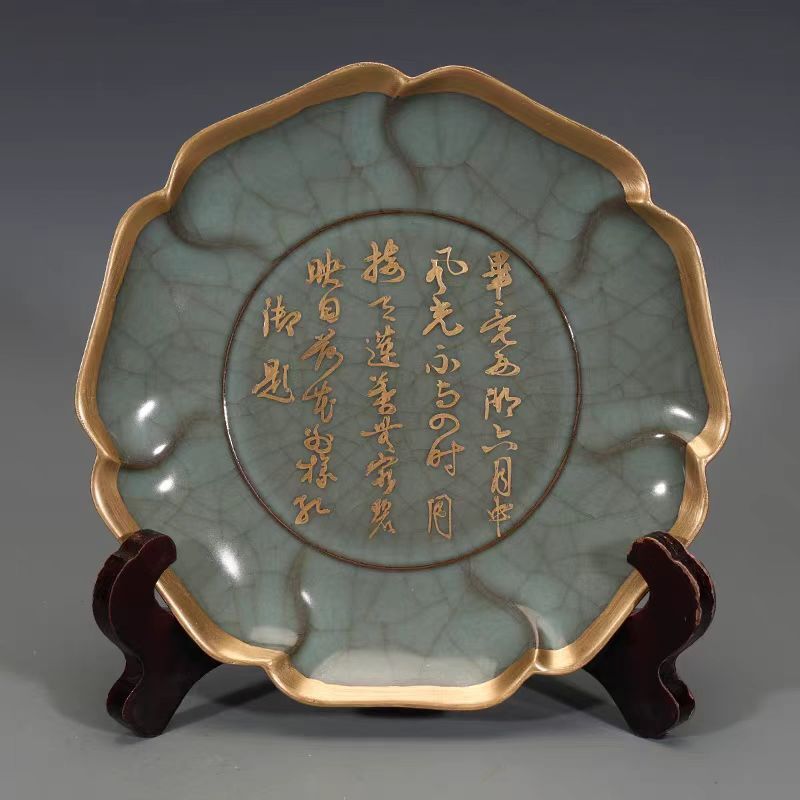 - 宋代 古陶磁器 官窯 青釉 描金 刻字 花口盤 盤子 瓷器 古擺件 置物 時代物 古董品 骨董 旧家蔵出し 唐物 中国古玩 古美術品