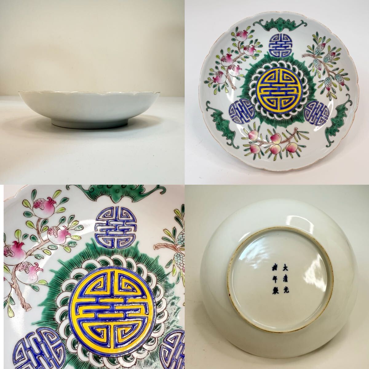 > X-中国古美術 時代物 色絵 粉彩 皿 中皿 飾皿 三多図 蝙蝠図 在銘 大清光緒年製 唐物 陶磁器 中国古玩 骨董品