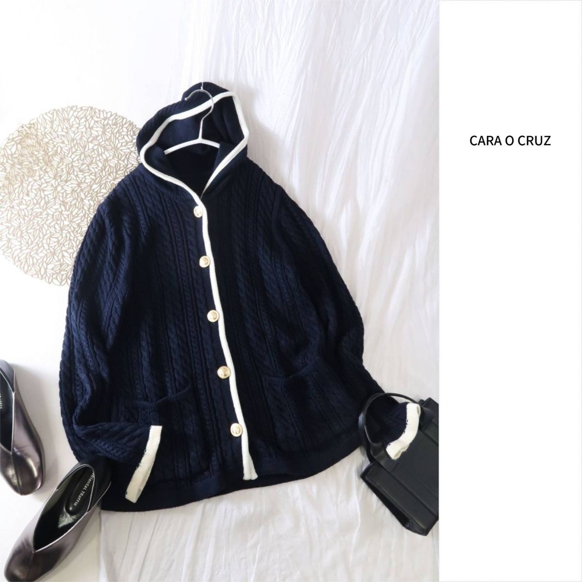 - レリアン Leilian/CARA O CRUZ☆配色パイピング ケーブル編み フード付きカーディガン 11サイズ 日本製 ☆A-O 6347