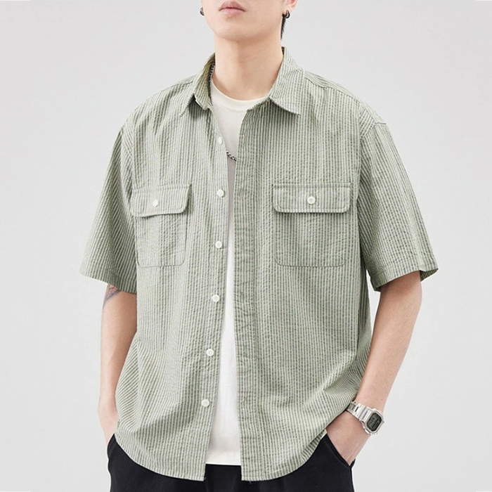 - ャツ 半袖シャツ ストライプ柄 シャツ メンズシャツ コットン 綿 カジュアルシャツ 開襟シャツ Zty-5495 グリーン L