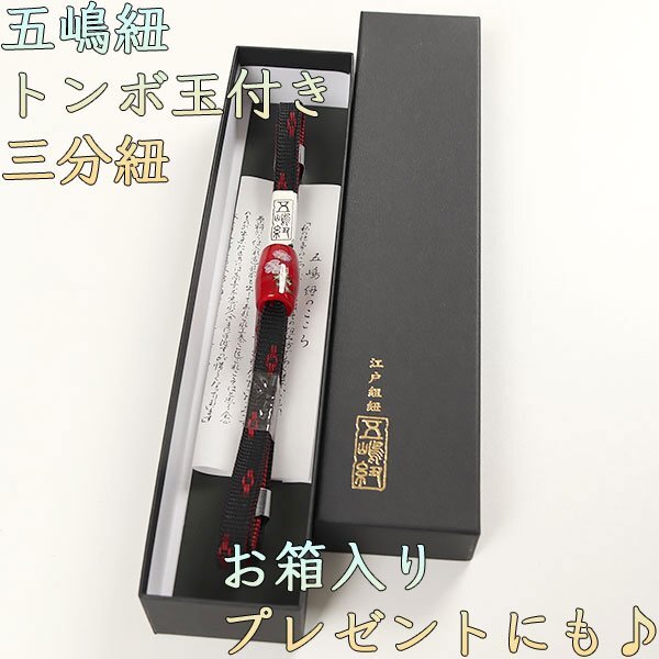 ※こちらの商品にはお仕立てはついておりません。 (Mサイズ/幅:0.9cm) 帯締めの最高峰『五嶋紐』の三分紐トンボ玉つきをご紹介致します。 こちらの三分紐は、黒色、赤色で可愛らしい模様が組まれており、 赤色のトンボ玉の帯留めがついております。 トンボ玉は取り外しが可能でございますので、お手持ちの三分紐に付替えていただくこともできます。 -状態・素材:正絹 -落款・証紙: -参考着用年代:20代~幅広い年代でお召しいただけます。 -着用時期 :夏頃