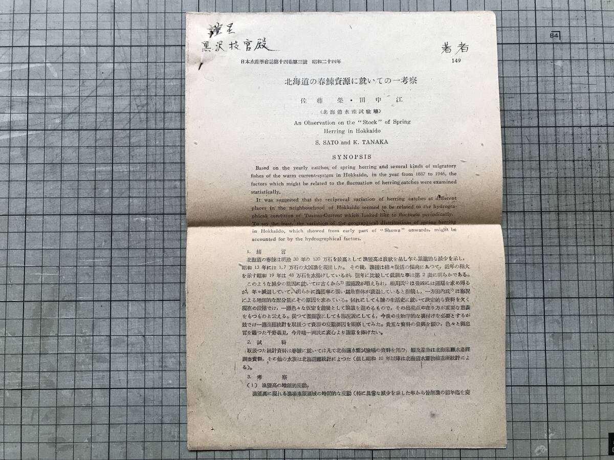 > 『北海道の春鰊資源に就いての一考察 日本水産学会誌第14巻第3号抜刷』佐藤栄・田中江 1949年刊 ※ニシン 北海道水産試験場 他 00604