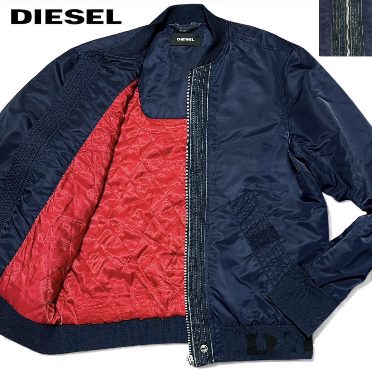 > 極美品/XL相当● ディーゼル デニム切替 フライトジャケット MA-1ブルゾン 裏地キルティング 中綿高級感◎ 紺 赤 メンズ DIESEL
