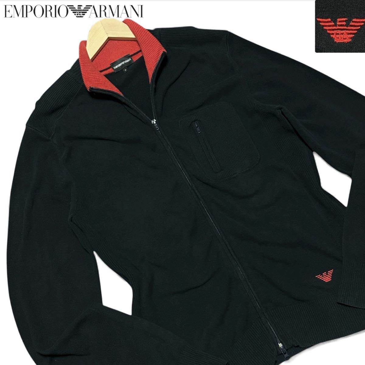 > 美品/XLサイズ●エンポリオ アルマーニ ドライバーズニット ブルゾン 刺繍ロゴ ダブルジップ ストレッチ 黒 赤 メンズ EMPORIO ARMANI
