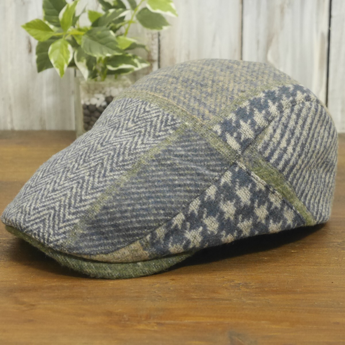 - ウール ハンチング つぎはぎ パッチワーク ネイビー グリーン シンプル サイズ調整可 送料\450 男女兼用