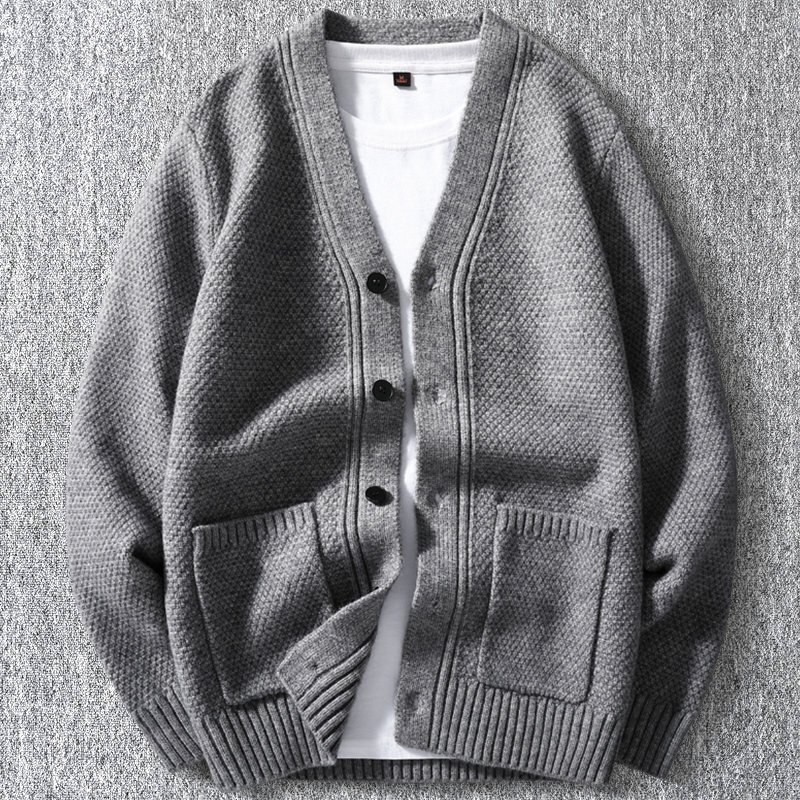 > 新品 ウール混 ニット カーディガン 秋冬 厚手 無地 Vネック セーター メンズ 秋冬 暖かさ ニットジャケット アウター グレー T6181-XXL