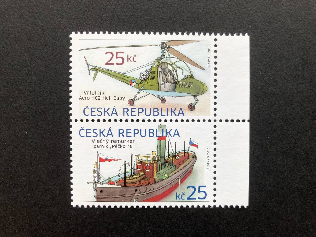 - 外国切手: チェコ切手 「(歴史的乗り物)ヘリコプター〈Aero HC2 - Heli Baby〉と蒸気タグボート〈ペチコ〉」2種連刷 未使用