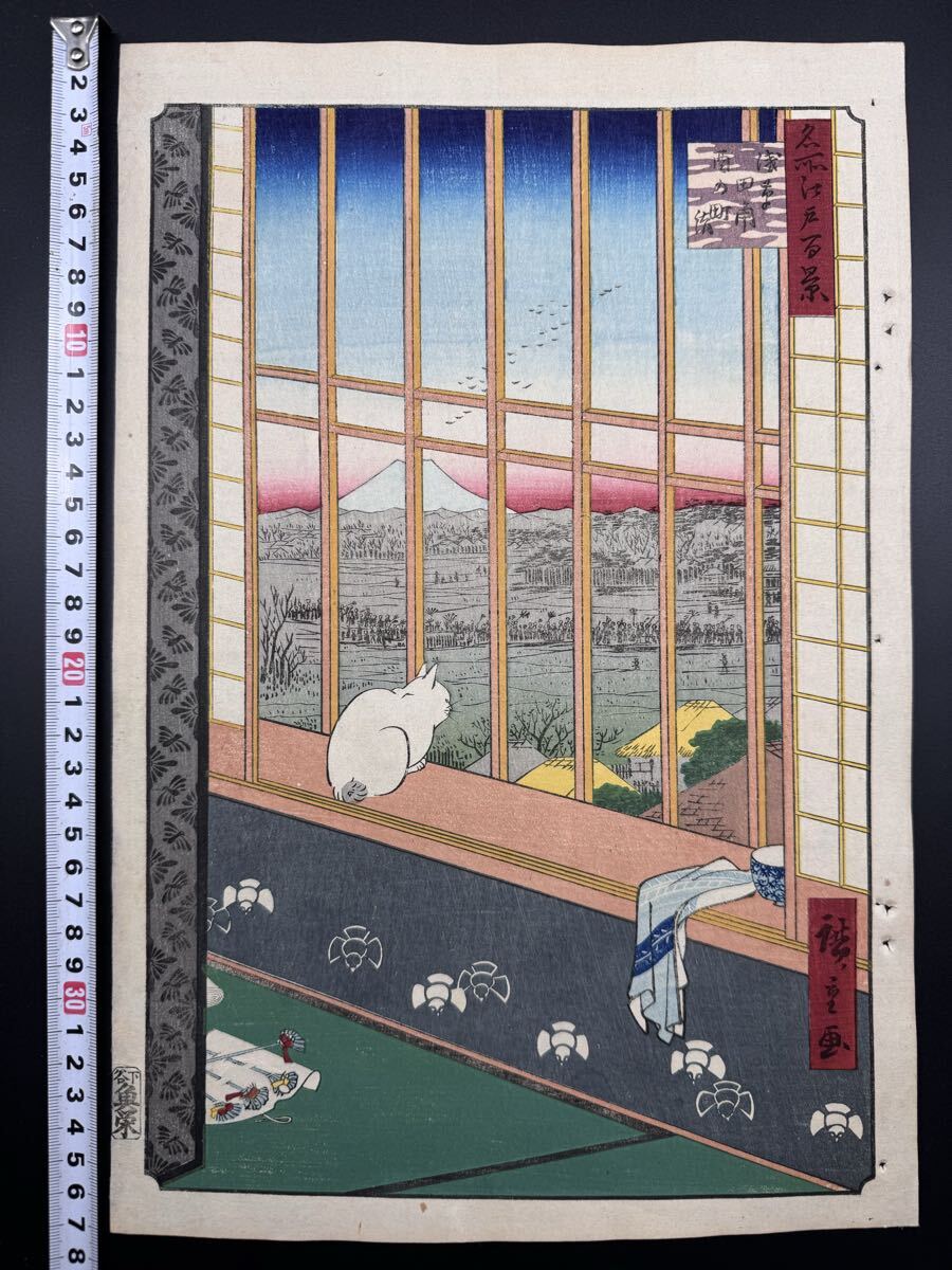 - 【真作】名作!本物浮世絵木版画 初代 歌川広重「名所江戸百景 浅草田圃 酉之町参拜」江戸期 名所絵 大判 錦絵 保存良い