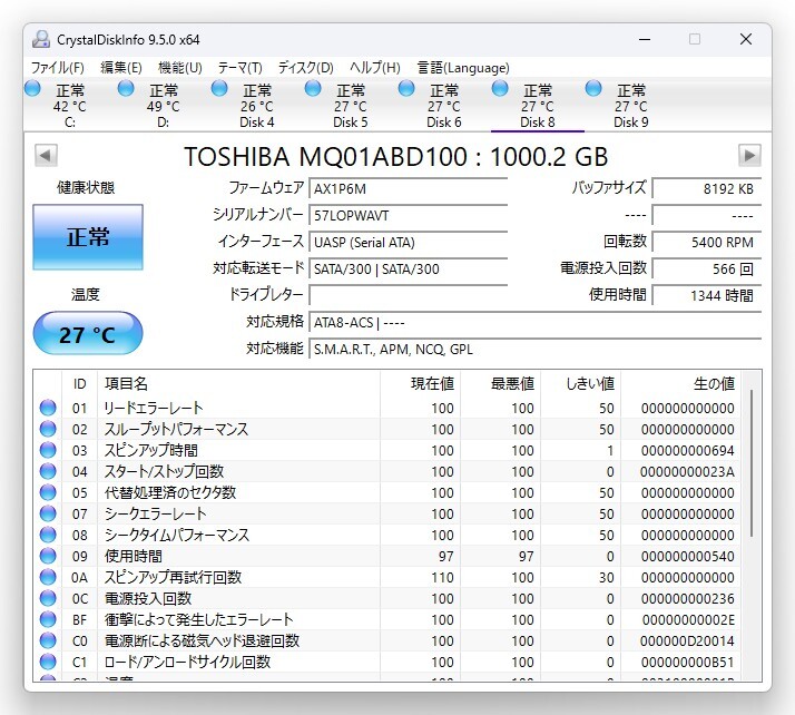 - 使用時間1344時間★送料無料★正常判定品★東芝★1TB★HDD SATA★2.5インチ 9.5mm★