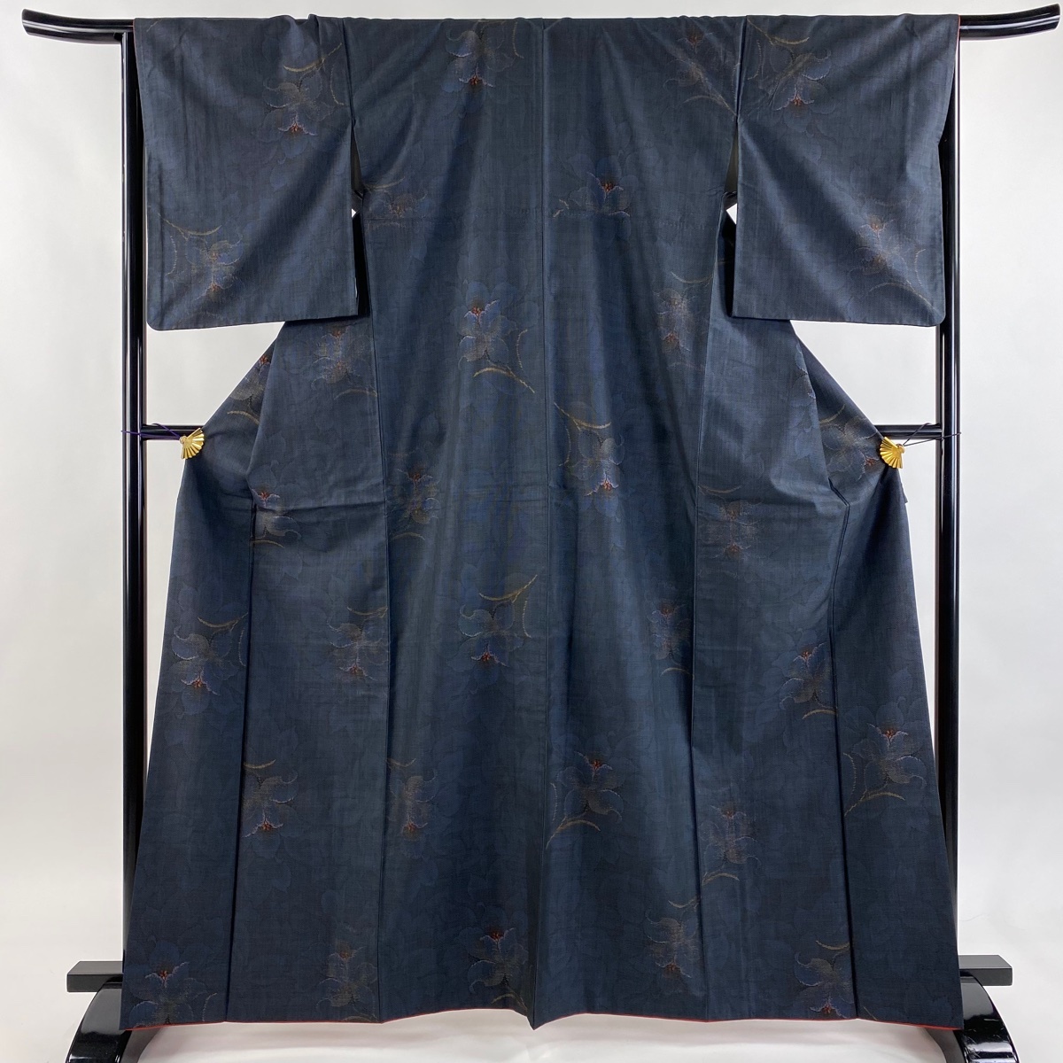 - 【美品】 大島紬 身丈166.5cm 裄丈66.5cm M 袷 純泥染 証紙 草花 紺色 正絹 秀品 【中古】