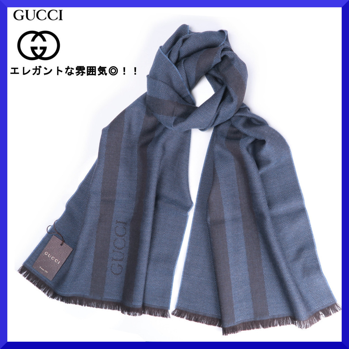 - 価格6,5万新品本物グッチGUCCI【ジャガードヘリンボーン織りのドレープ感◎大人の格上げ】ウールマフラー/ストール/メンズ/ビジネス/青