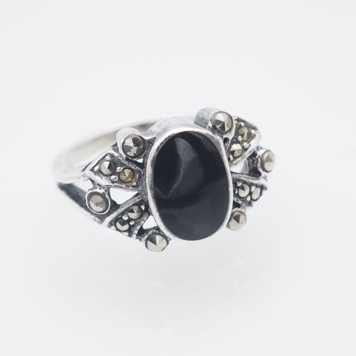 > H617 オニキス風 マーカサイト マルカジット 925刻印 リング インレイ デザイン シルバー 指輪 ヴィンテージ 13号