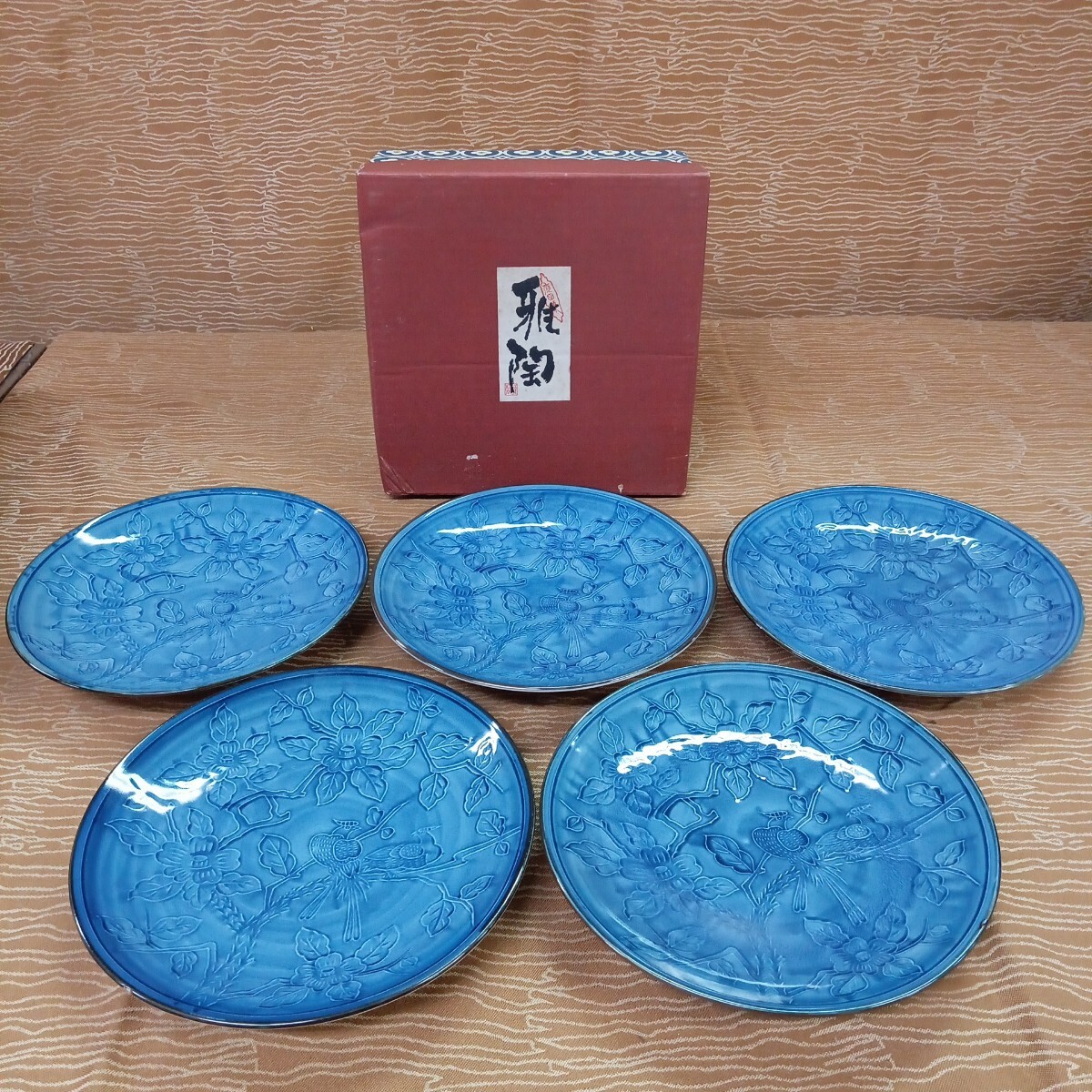 > 【有田焼 哲三郎窯 和皿揃 5枚】彫花鳥 中皿 濃紺 染付 和食器 陶器 食器 【A9-4①】1113
